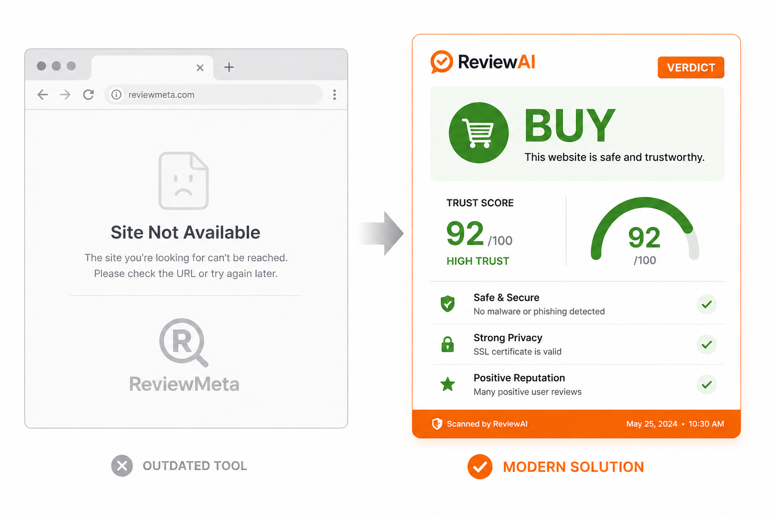 Quick Answer: ReviewMeta went offline in early 2026. The best ReviewMeta alternative is ReviewAI, which delivers a BUY/SKIP/CAUTION verdict in 10 seconds, cross-references Amazon reviews with Reddit and YouTube, and adjusts its analysis based on your buyer persona. It's not just a replacement. It's an upgrade.