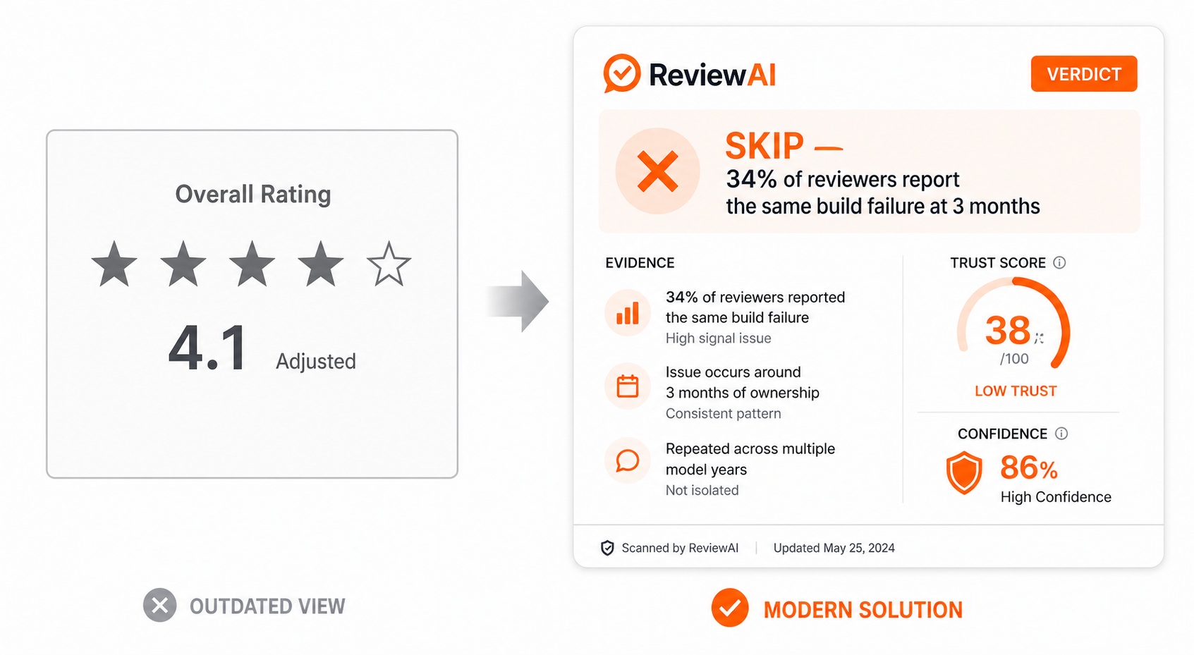 ReviewMeta's core limitation wasn't its accuracy — it was that a cleaned-up star rating still isn't a verdict. Shoppers need a decision, not a number.